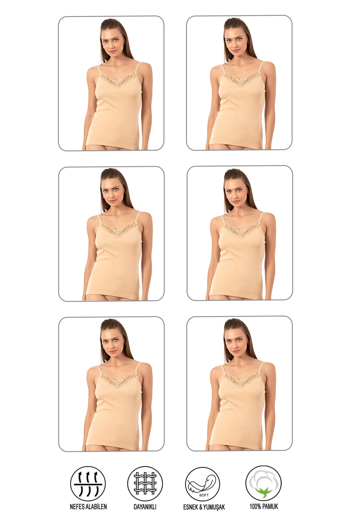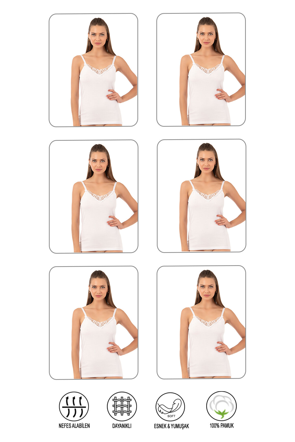 Özkan 0110 6'lı Paket Kadın Ribana %100 Pamuklu Güpürlü Esnek Rahat Ince Askılı Atlet;