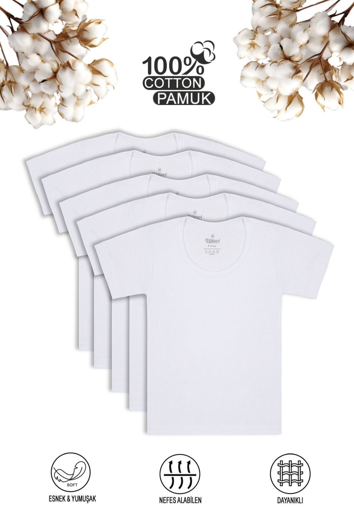 Özkan 0803 5'li Paket Erkek Çocuk %100 Pamuklu Ribana Esnek Rahat Kısa Kollu Geniş Yaka Atlet Fanila;