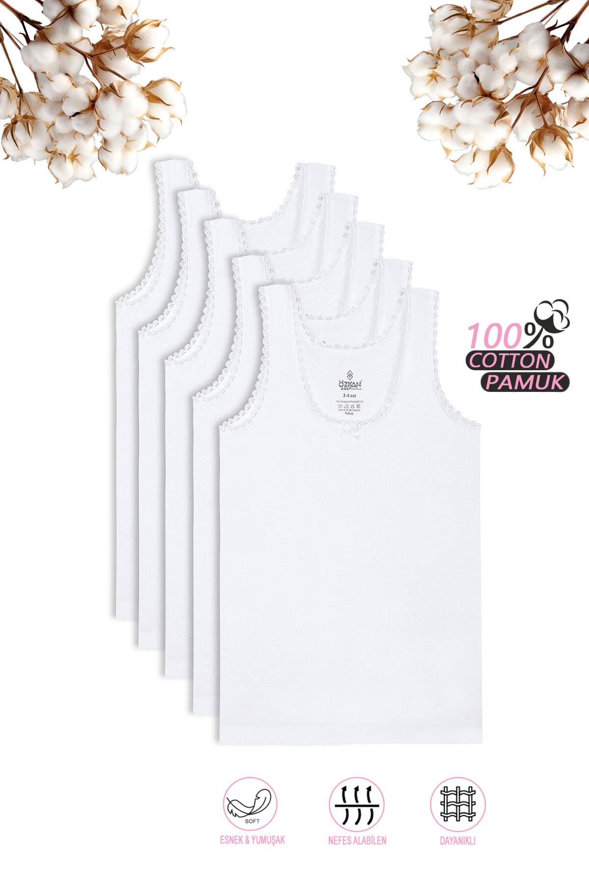 Özkan 1605 5'li Paket Kız Çocuk %100 Pamuklu Ribana Yakası Dantel Detaylı Esnek Rahat Kalın Askılı Atlet;