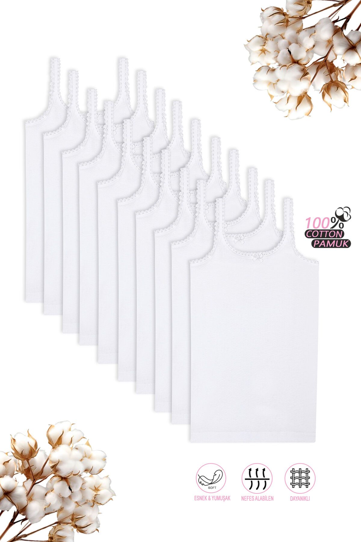 Özkan 1610 10'lu Paket Kız Çocuk %100 Pamuklu Ribana Yakası Dantel Detaylı Esnek Rahat İnce Askılı Örme Atlet;