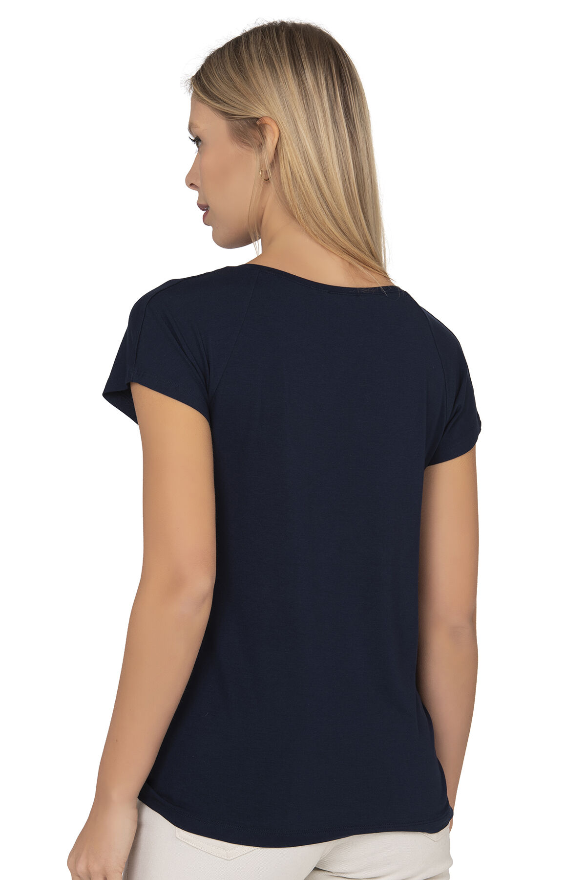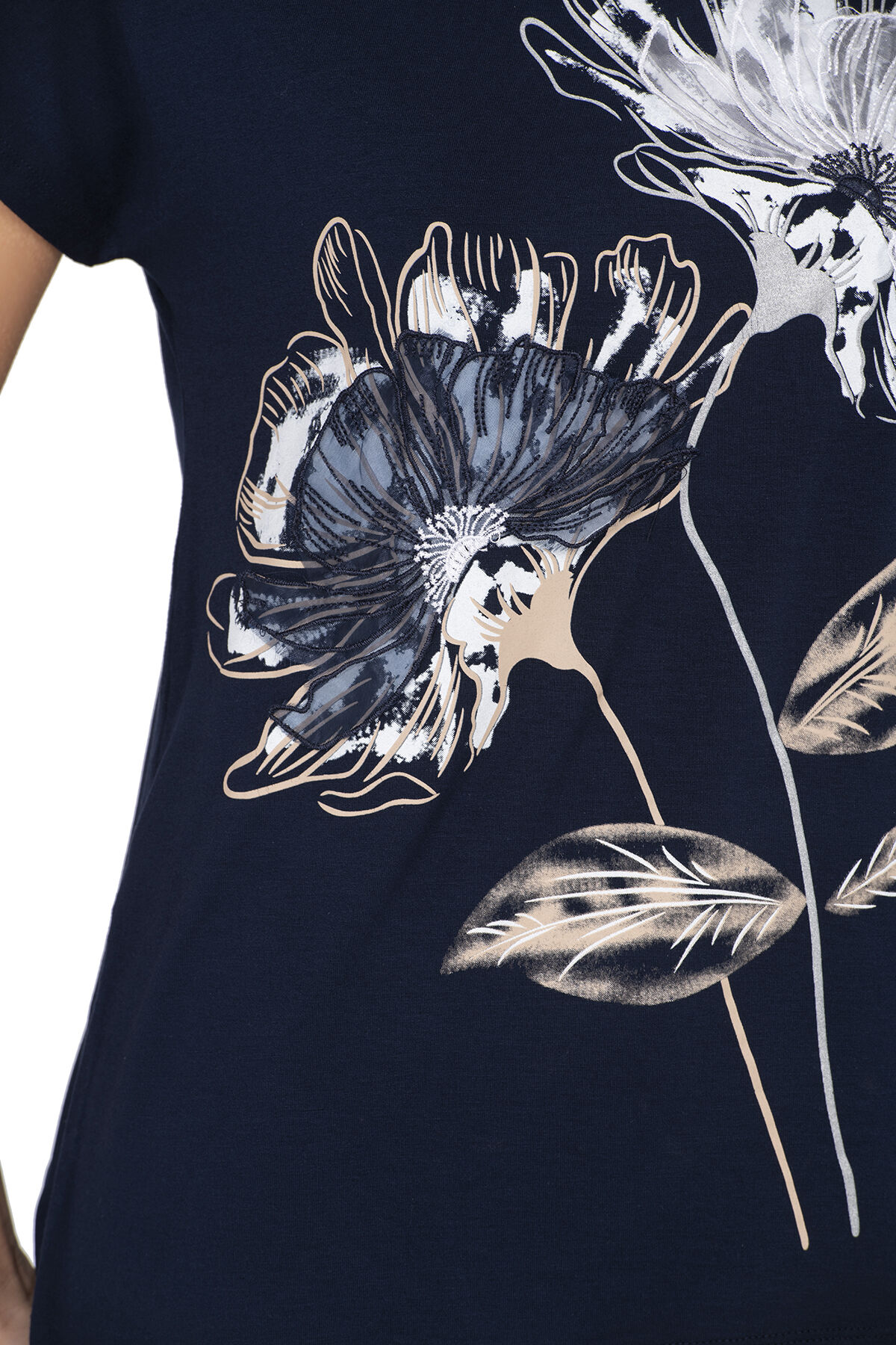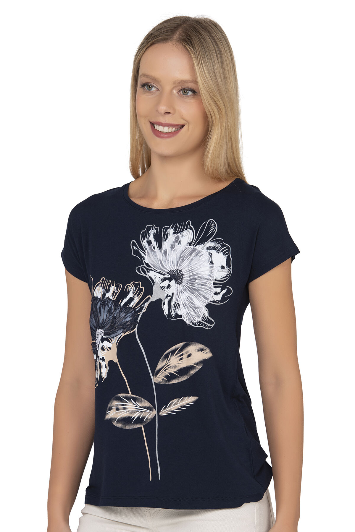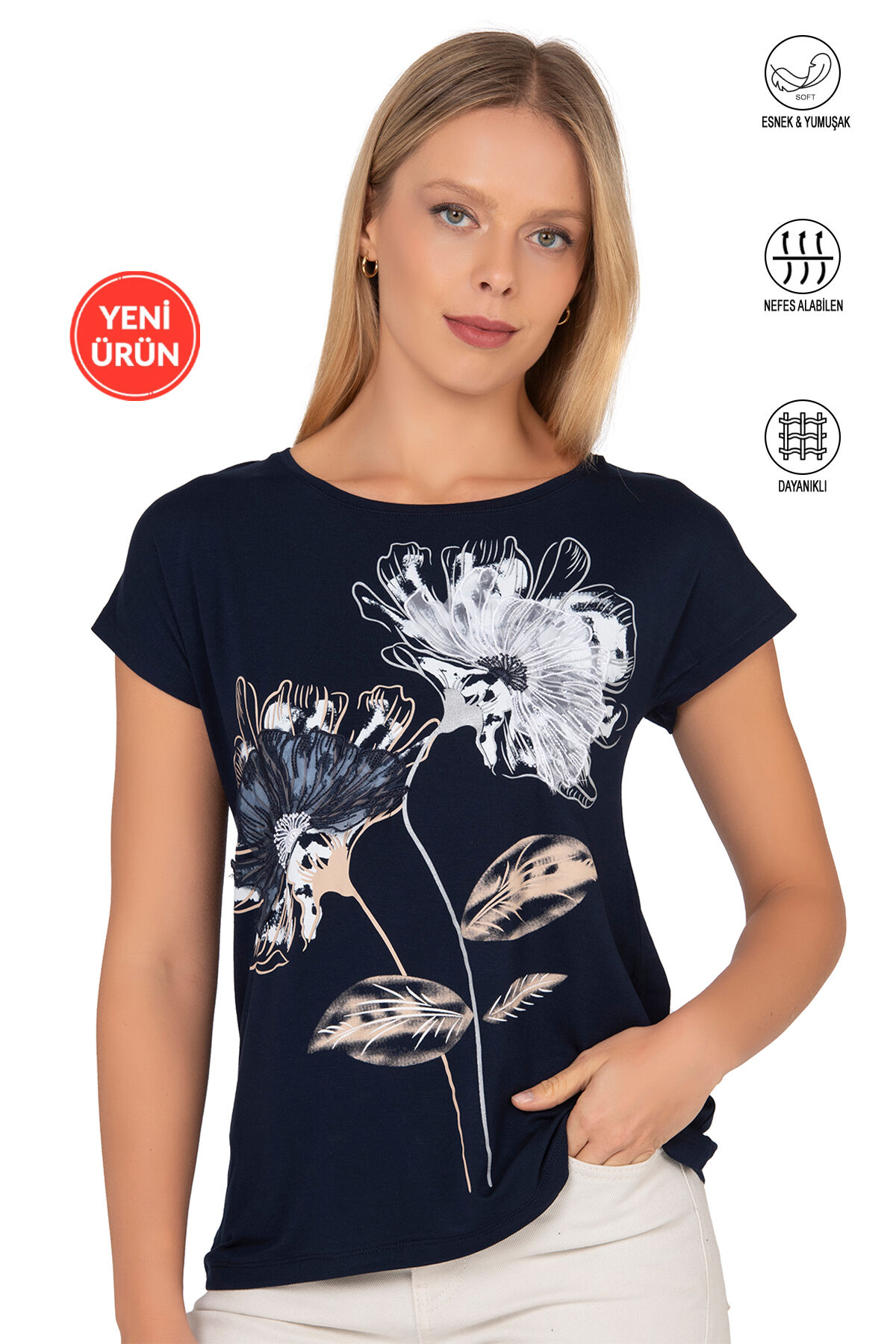 Özkan 23272 Kadın Lacivert Vorteks Viskon Premium Kumaş Örme Bluz Önü Çiçek Baskılı Likralı Kısa Kollu
