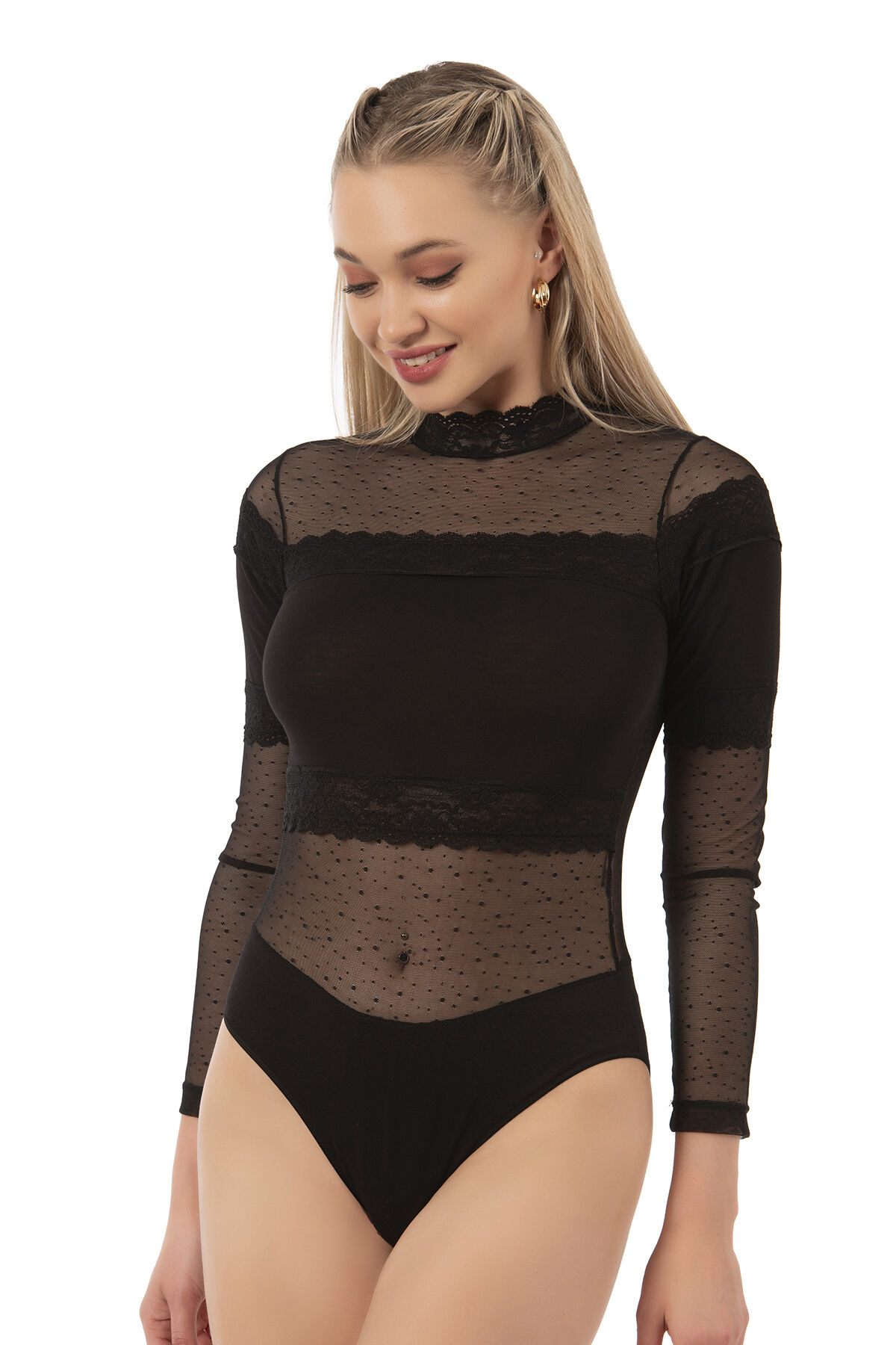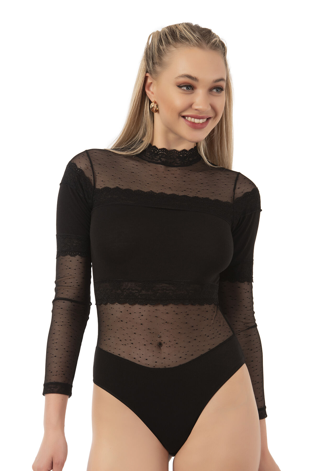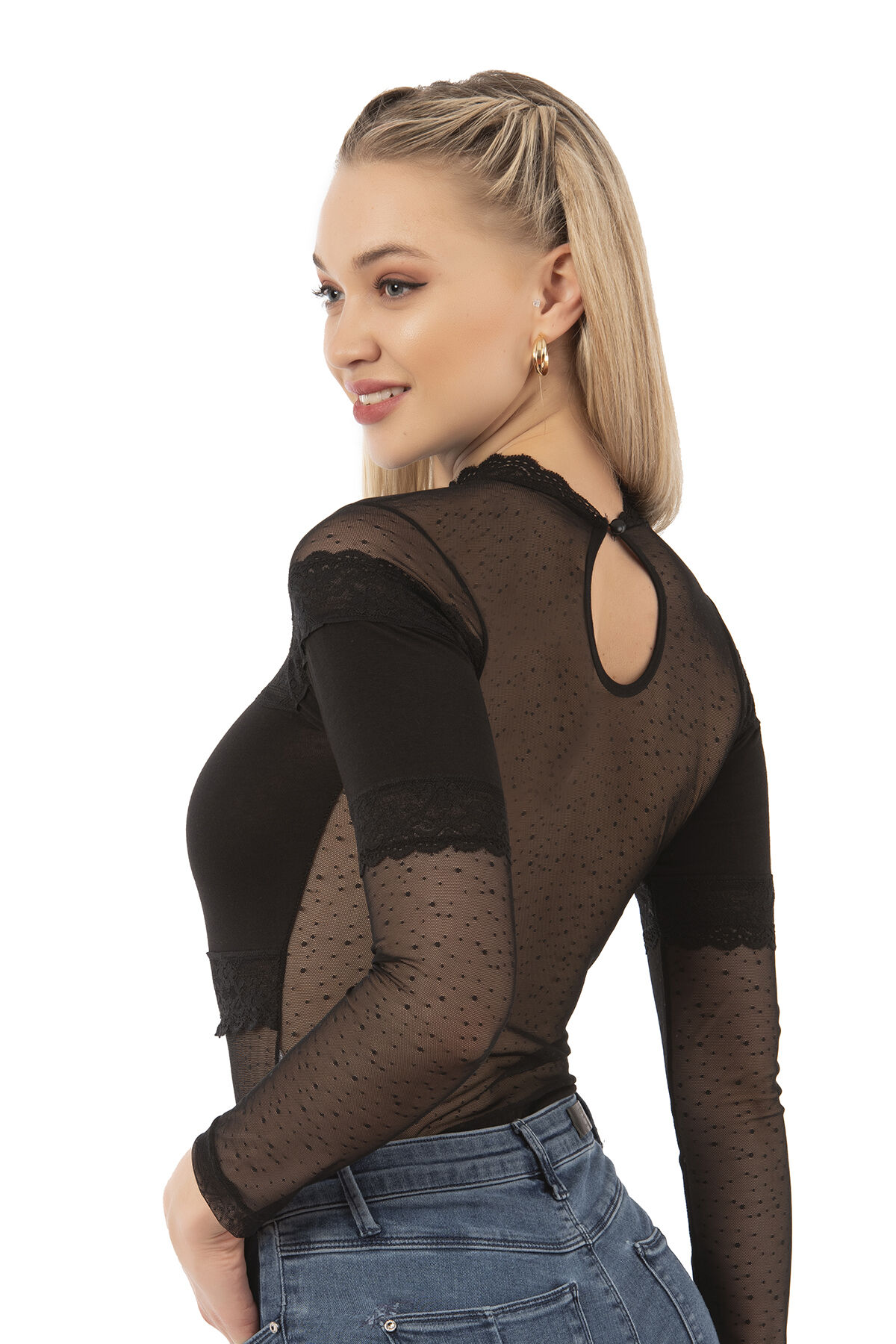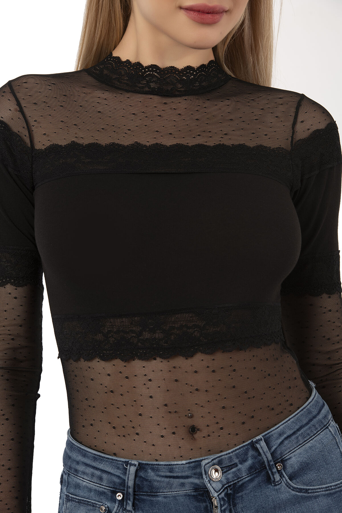 Farklı kıyafetlerinizle birlikte yada tek başına kullanabileceğiniz uzun kollu tül detaylı şık bir modeldir.;