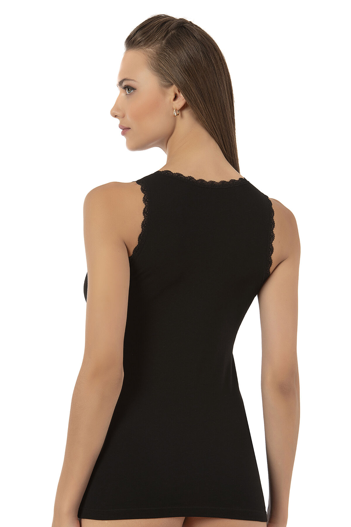 Farklı kıyafetlerinizle birlikte kullanabileceğiniz kalın askılı şık bir modeldir. Yakası ve yan kısmı dantel işlemelidir.;