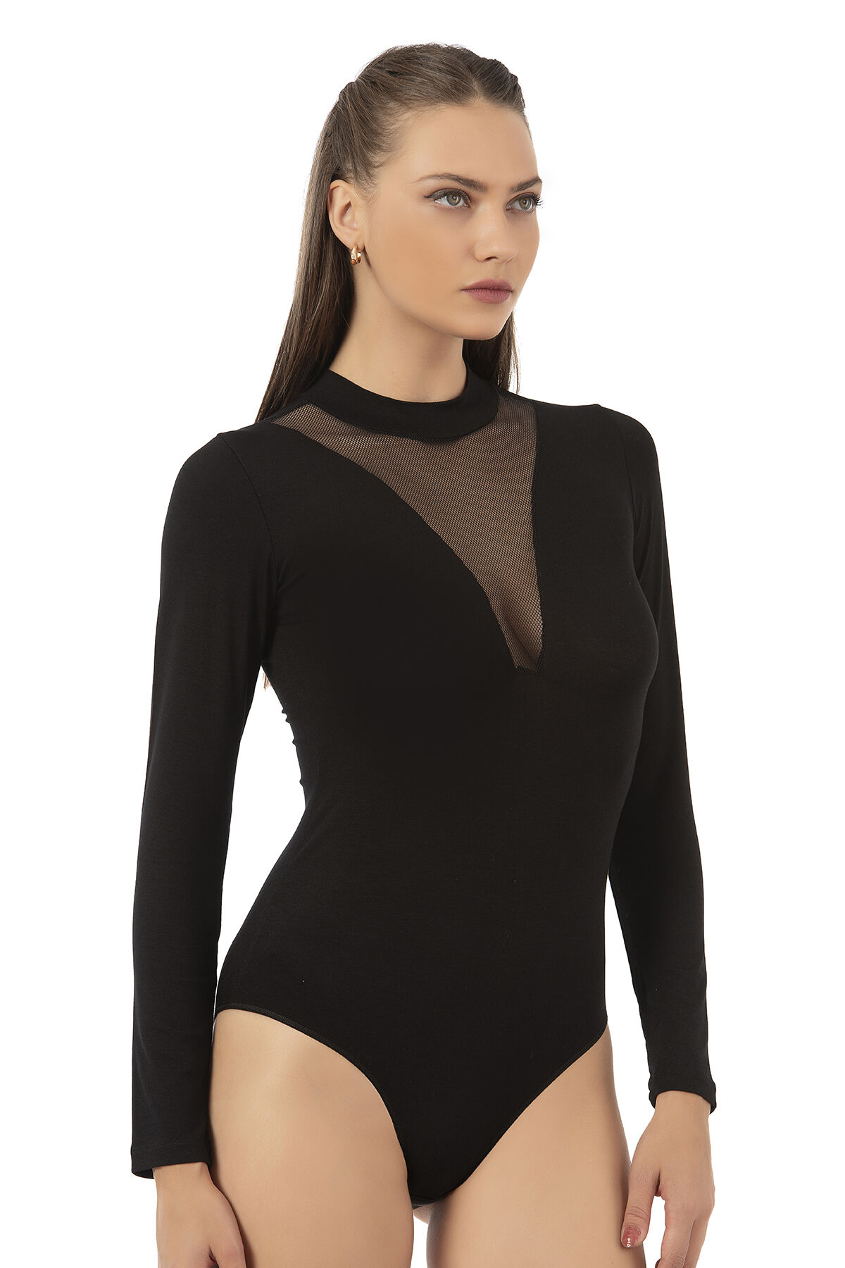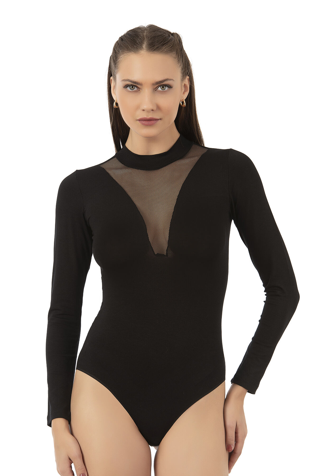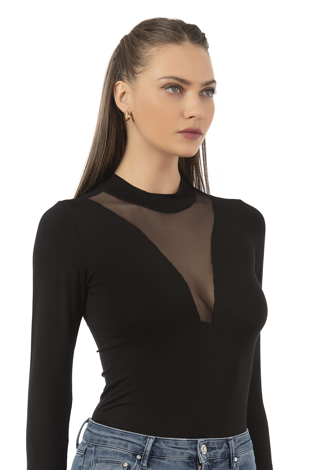 Özkan 25783 Kadın Ring Viskon Yarım Balıkçı Yaka Uzun Kollu Yakası Tül Detaylı Kancalı Çıtçıtlı Body