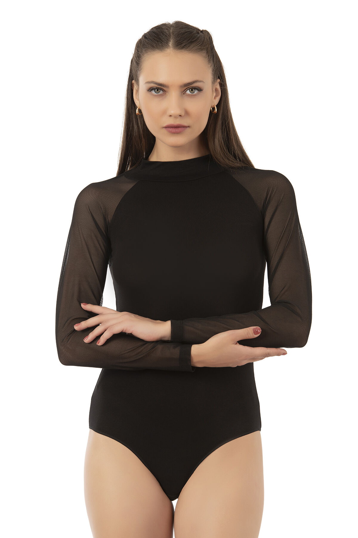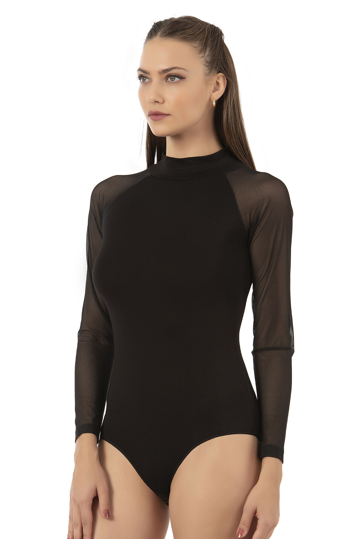 Özkan 25818 Kadın Ring Viskon Yarım Balıkçı Yaka Tül Detaylı Uzun Kollu Kancalı Çıtçıtlı Body