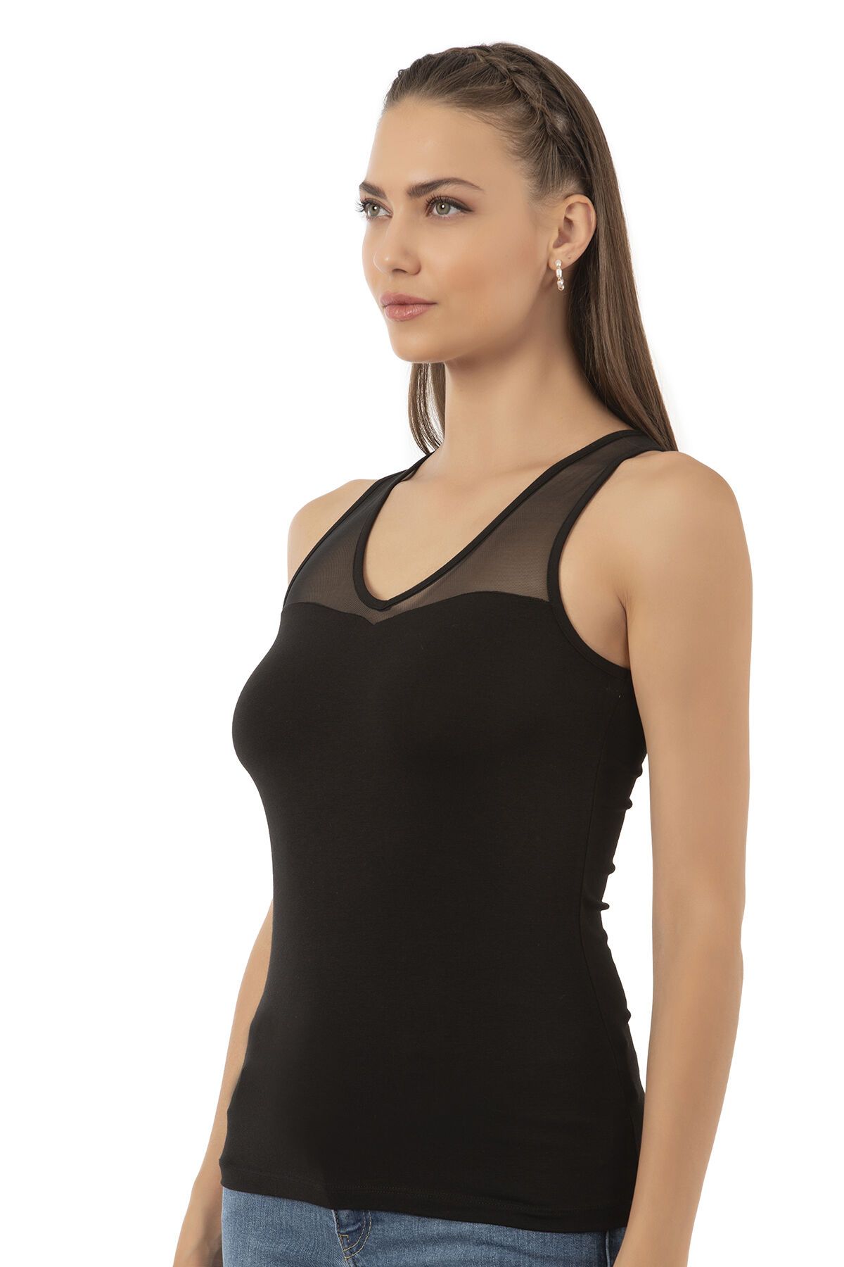 Özkan 26531 Kadın Pamuklu Modal V Yaka Tül Detaylı Kalın Askılı Atlet;