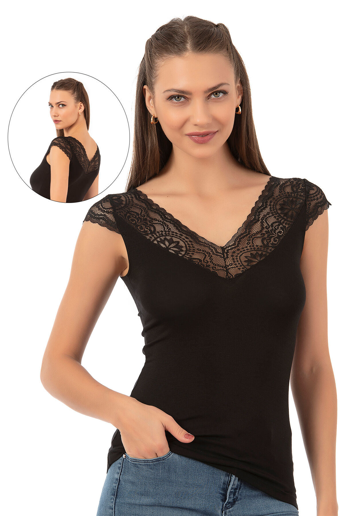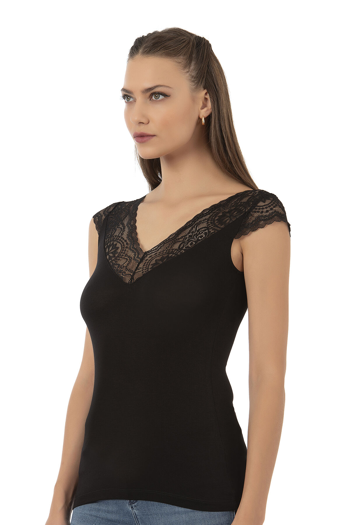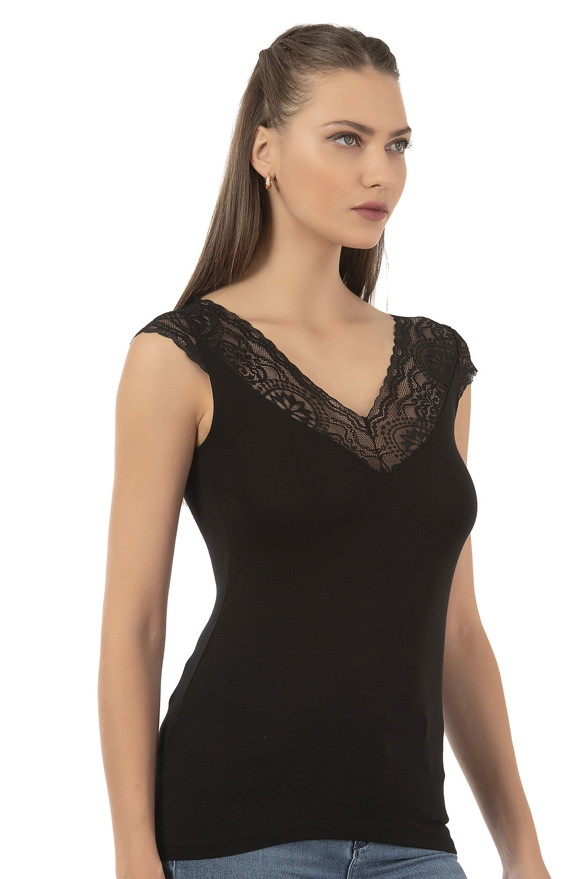 Özkan 26977 Kadın Ring Viskon Esnek Yumuşak V Yaka Dantel Sırt Detaylı Atlet;