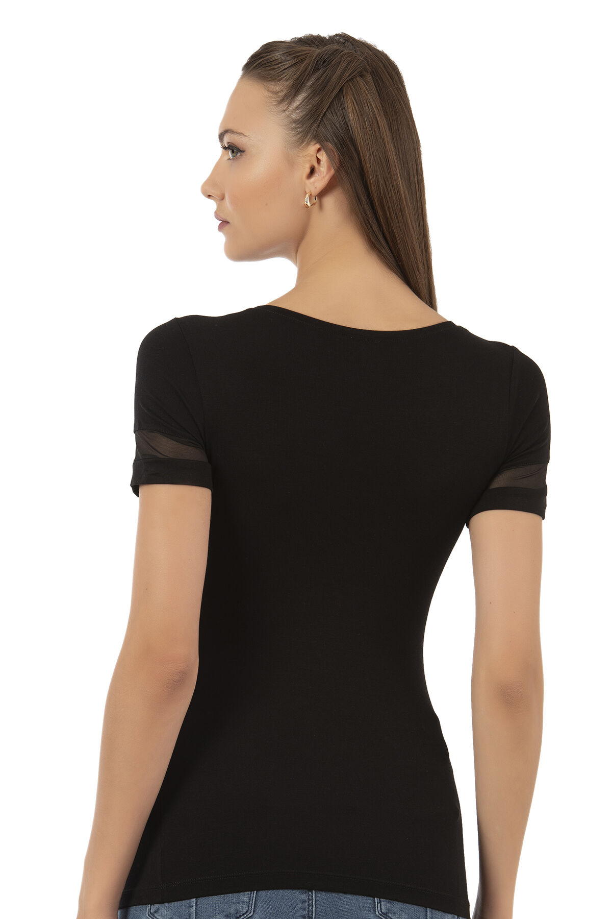 Özkan 26983 Kadın Premium Yumuşak Rahat Kumaş Ring Viskon Bisiklet Yaka Tül Detaylı Kısa Kollu Örme Bluz;