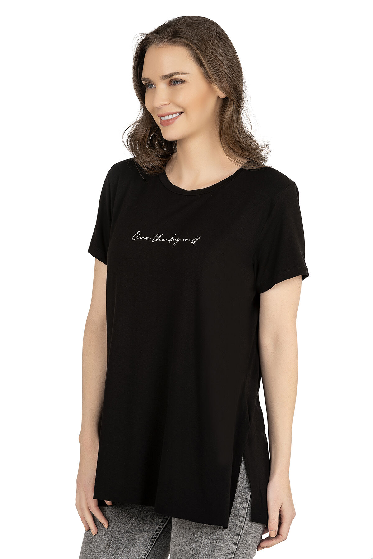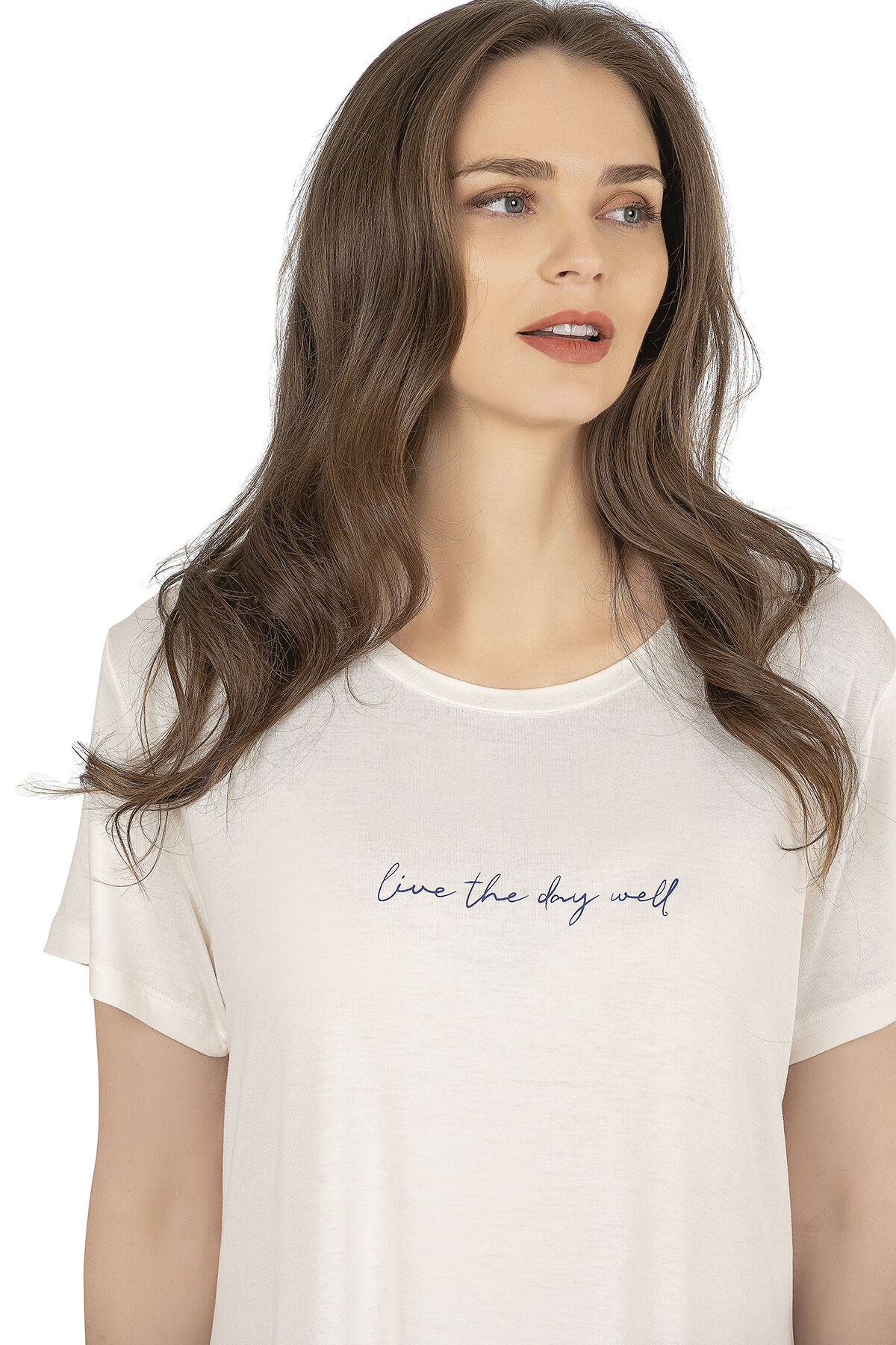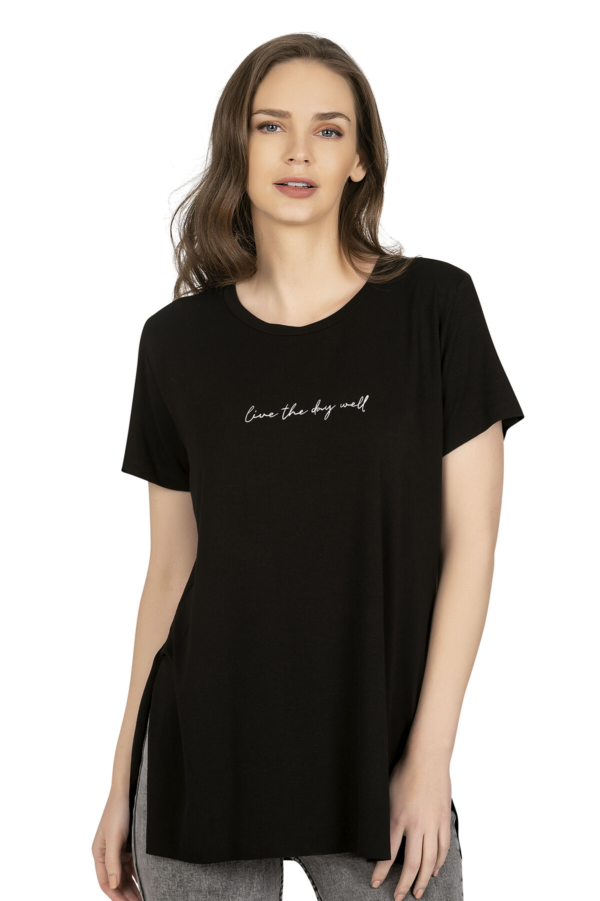 Özkan 27082 Kadın Premium Yumuşak Esnek Kumaş Vorteks Viskon Likralı Önü Yazılı Bisiklet Yaka Kısa Kollu T-shirt