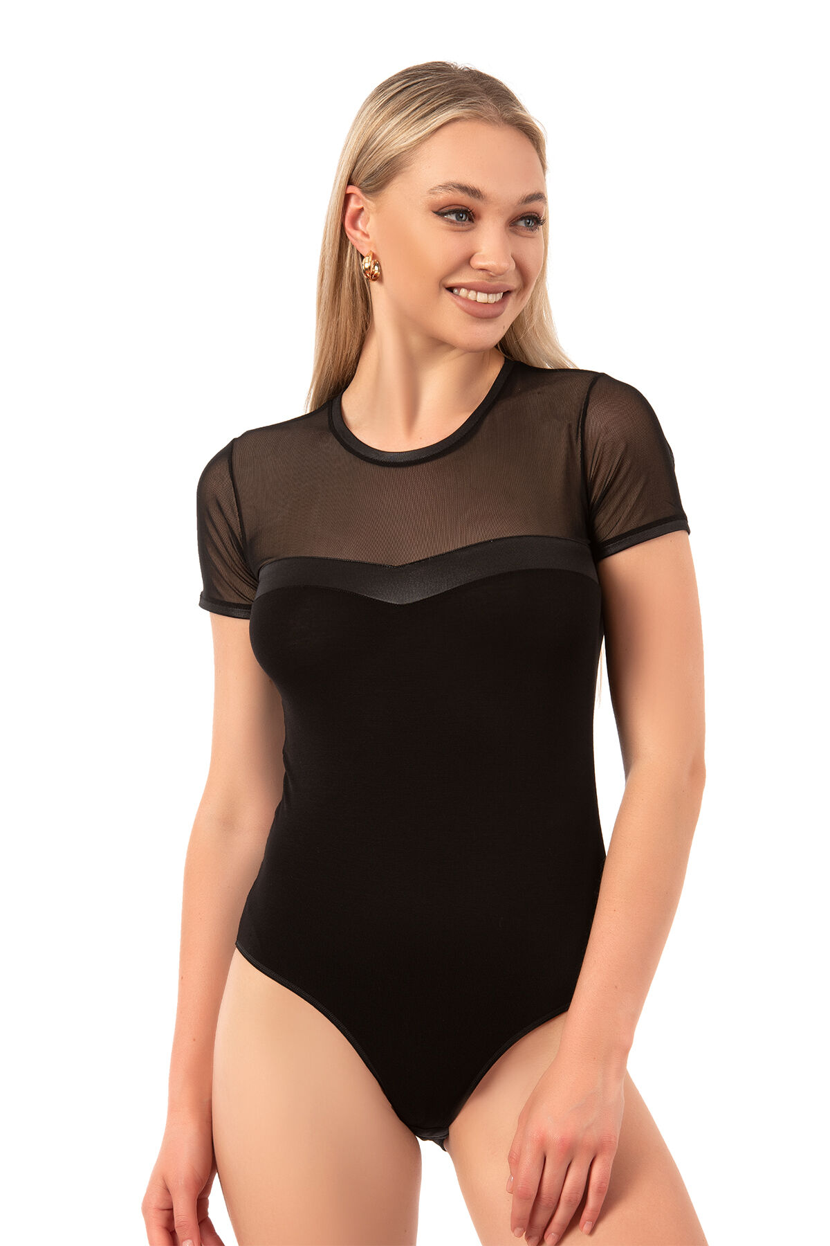 Özkan 27092 Kadın Viskon Esnek Rahat Yaka Kısmı Saten ve Tül Detaylı Bisiklet Yaka Kısa Kollu Kancalı Çıtçıtlı Body Zıbın;