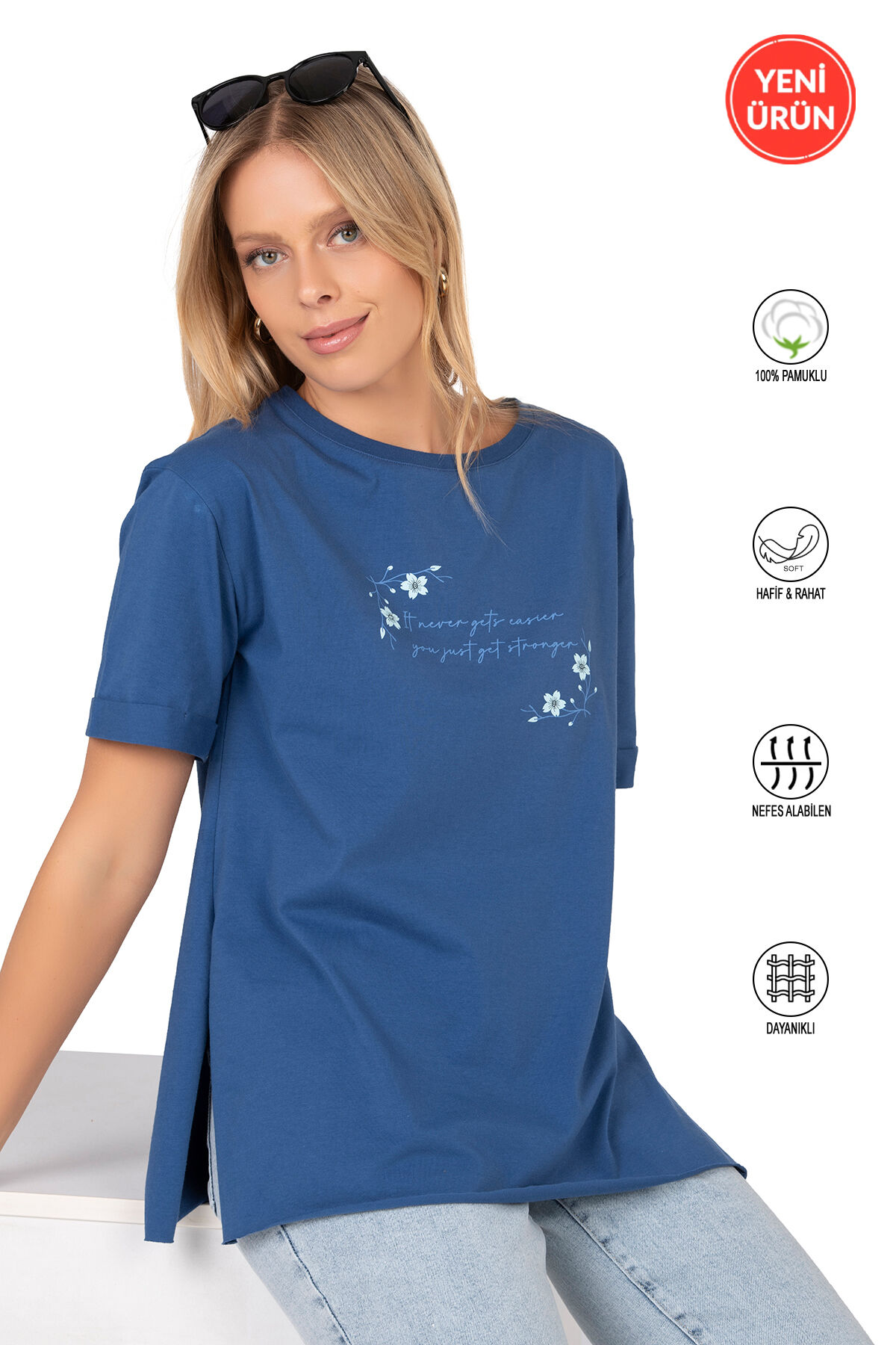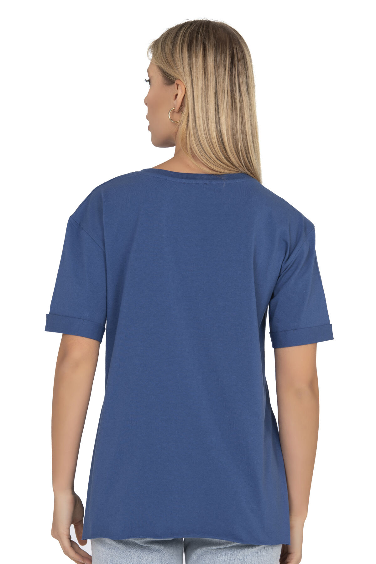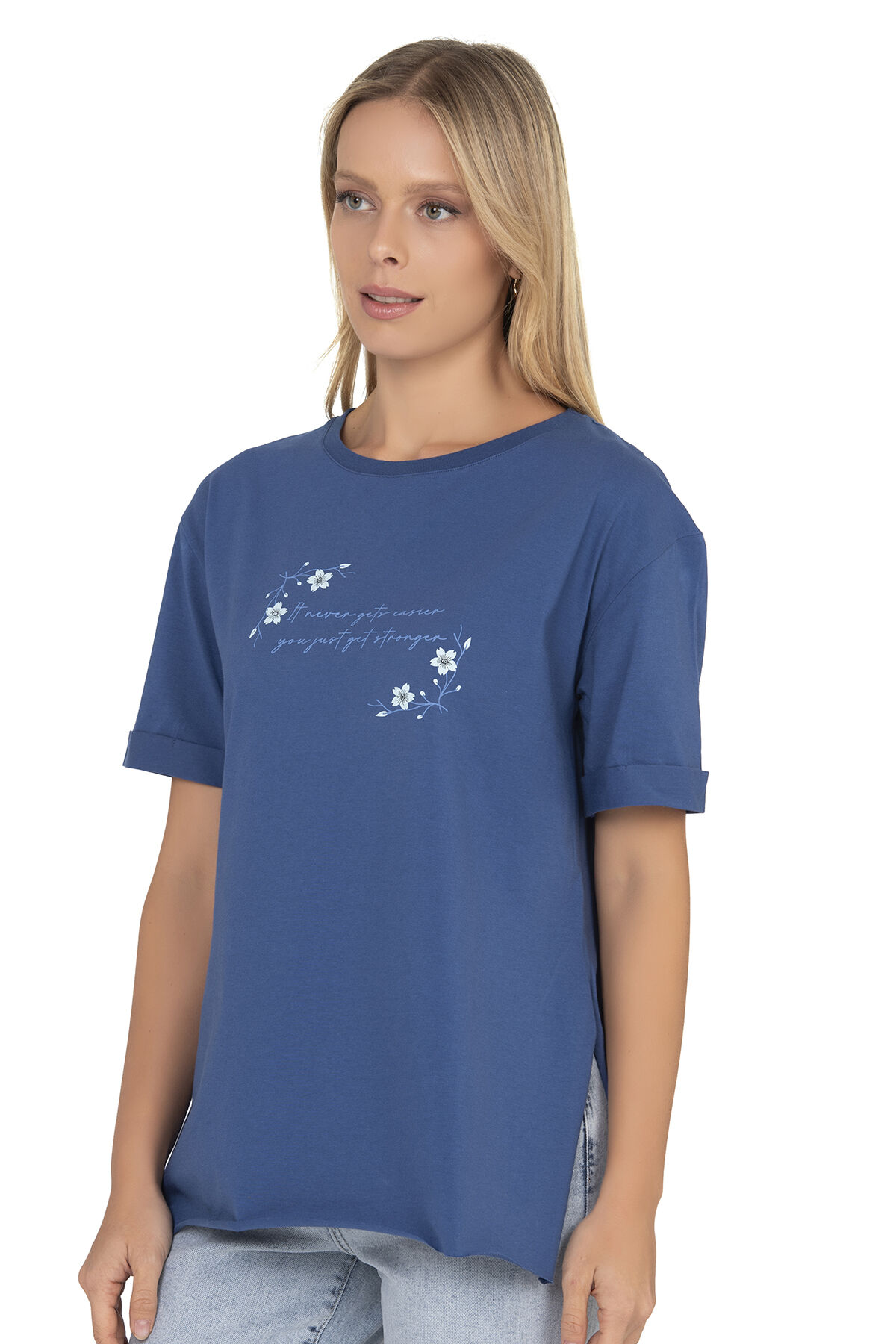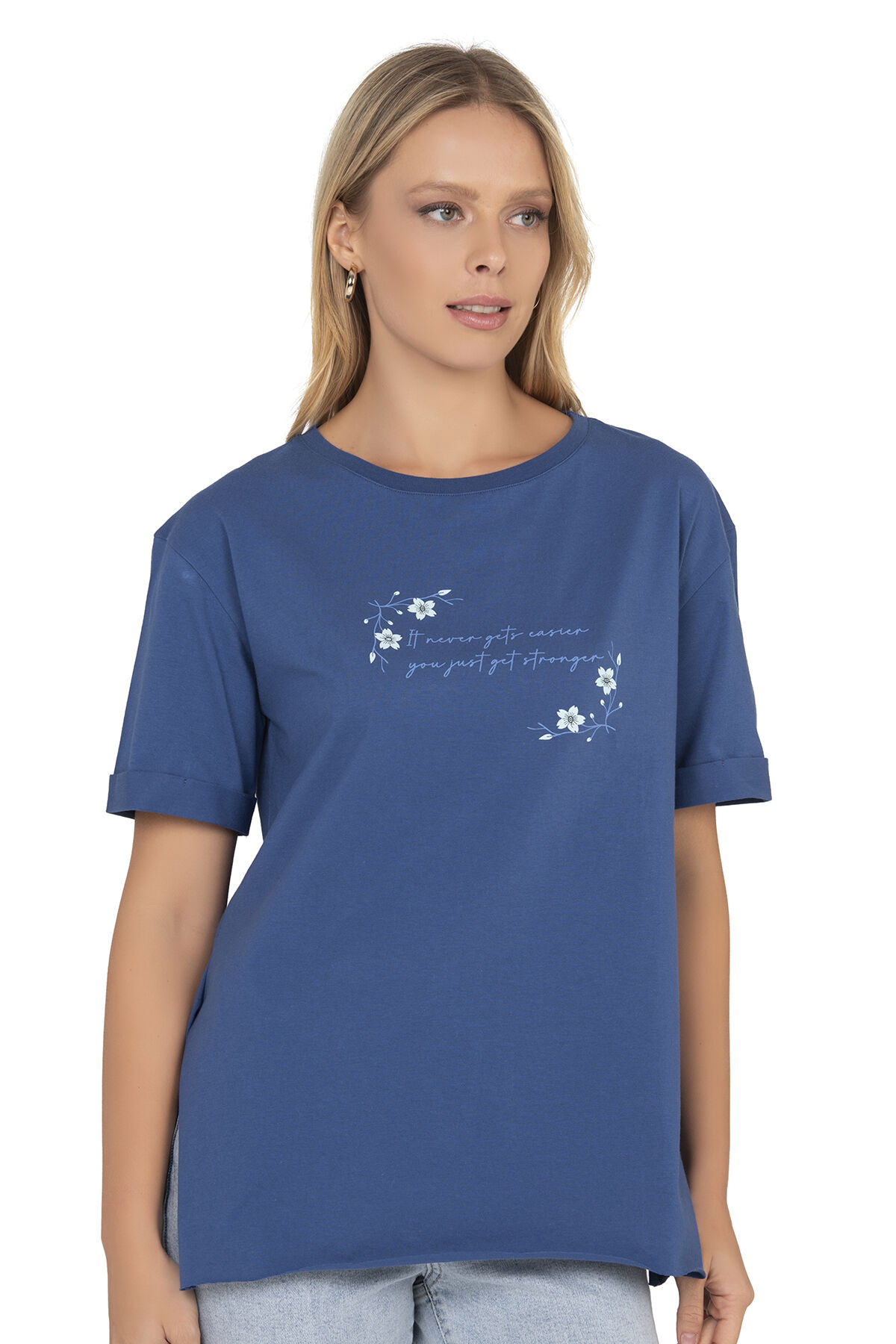 Özkan 27598 Kadın %100 Pamuklu Likrasız Süprem Mavi Önü Baskılı Esnek Rahat Bisiklet Yaka Kısa Kollu T-shirt;