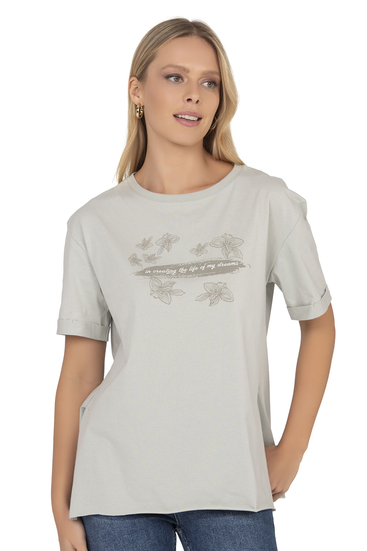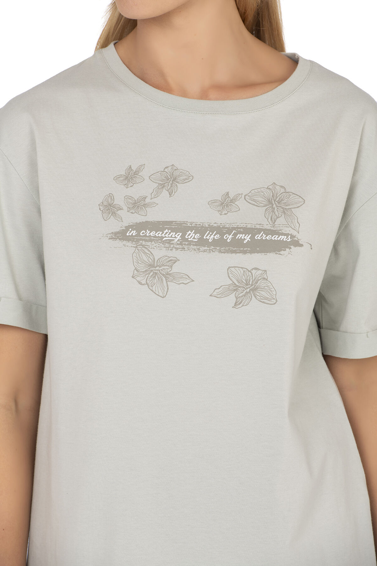 Özkan 27599 Kadın %100 Pamuklu Likrasız Süprem Yeşil Önü Baskılı Esnek Rahat Bisiklet Yaka Kısa Kollu T-shirt;