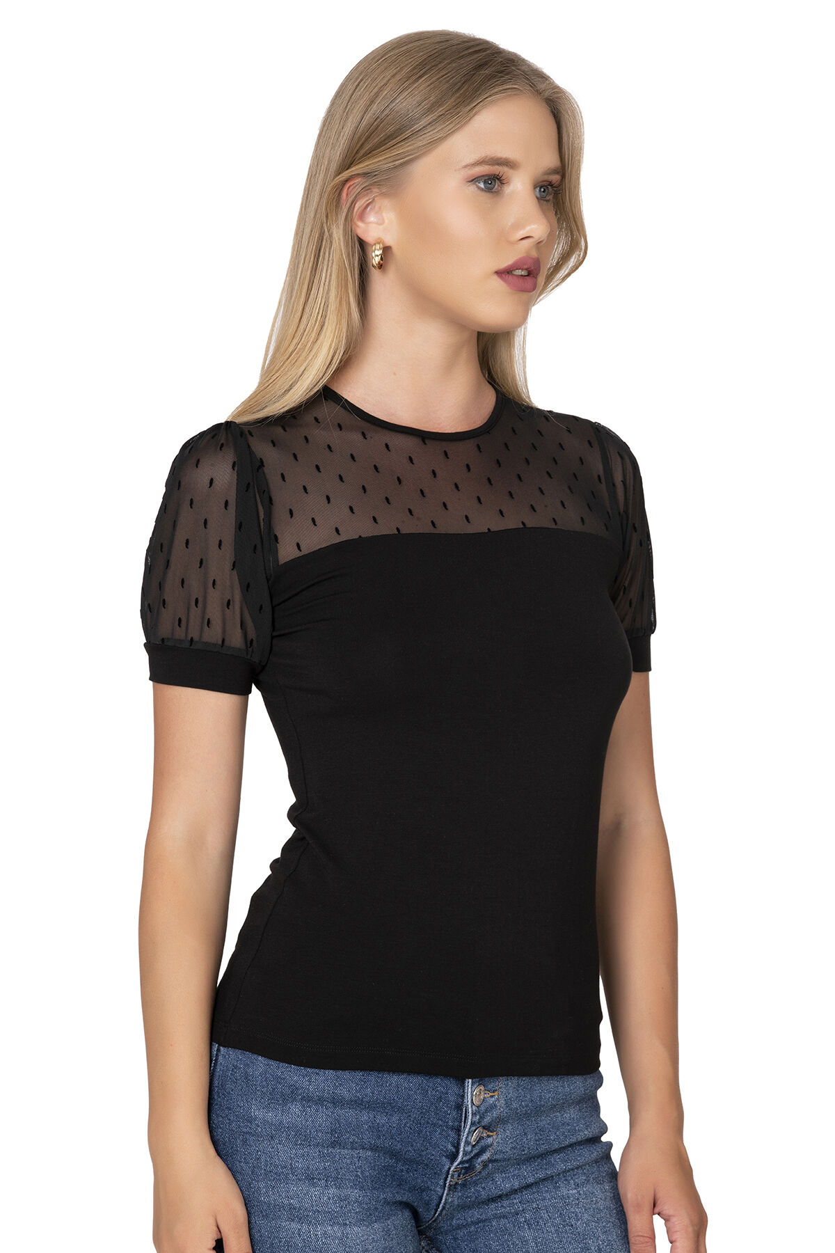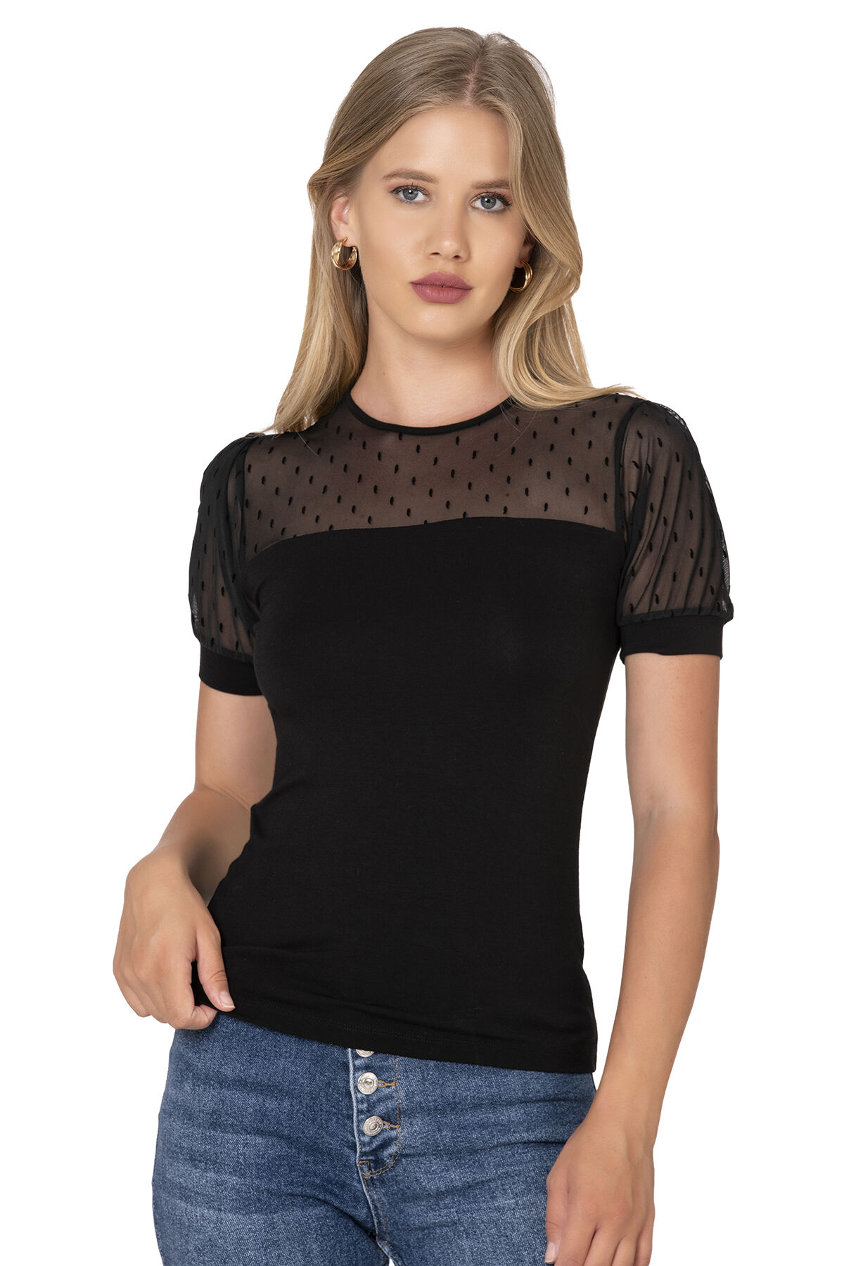 Özkan 27680 Kadın Premium Kumaş Ring Viskon Kısa Kollu T-Shirt Bluz Bisiklet Yaka Tül Detaylı;