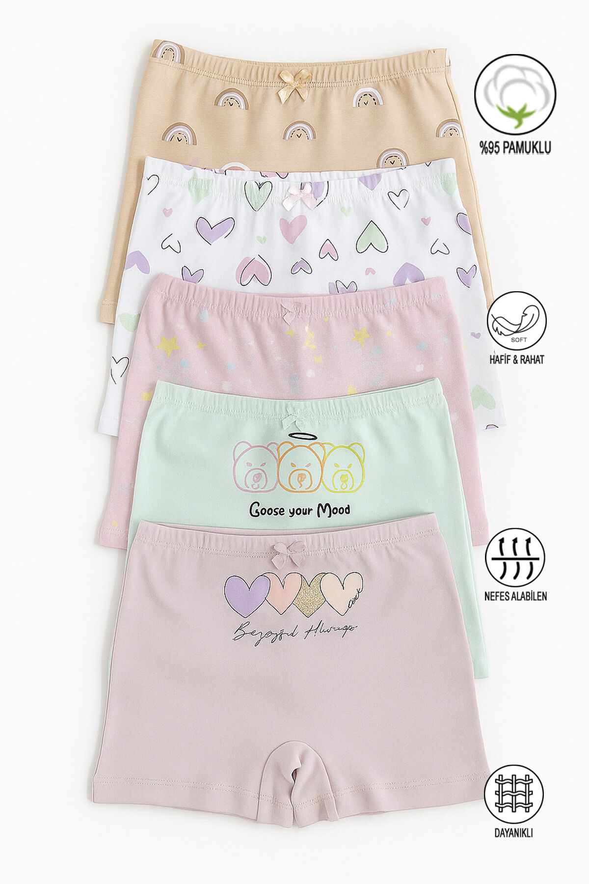 Özkan 41602 5'li Paket Kız Çocuk Karışık Renkli Desenli Pamuklu Yumuşak Rahat Şort Boxer;