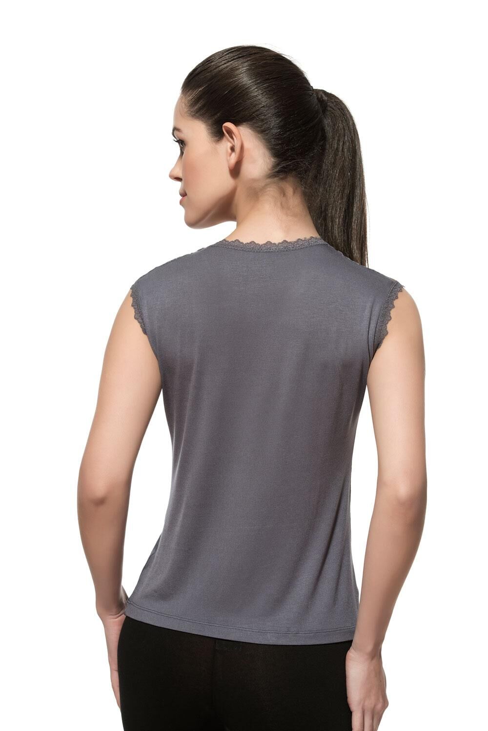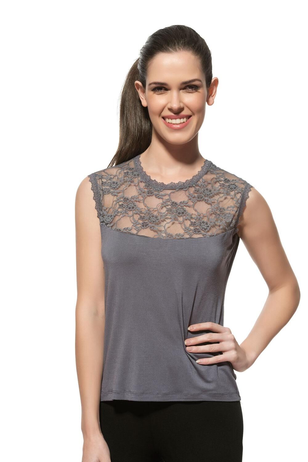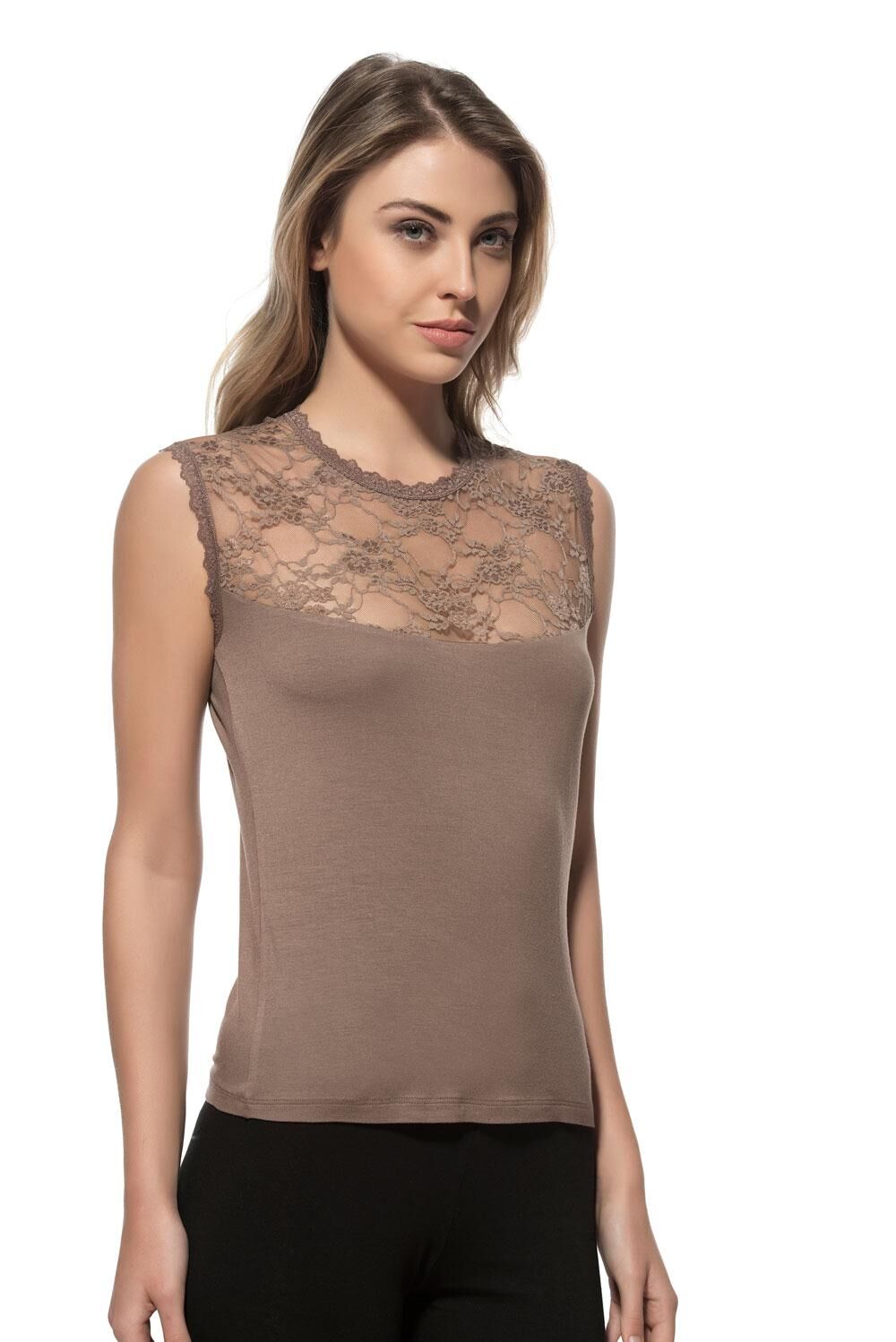 Özkan 7365 Kadın Premium Yumuşak Rahat Kumaş Viskon Dantel Detaylı Sıfır Kol Örme Bluz;