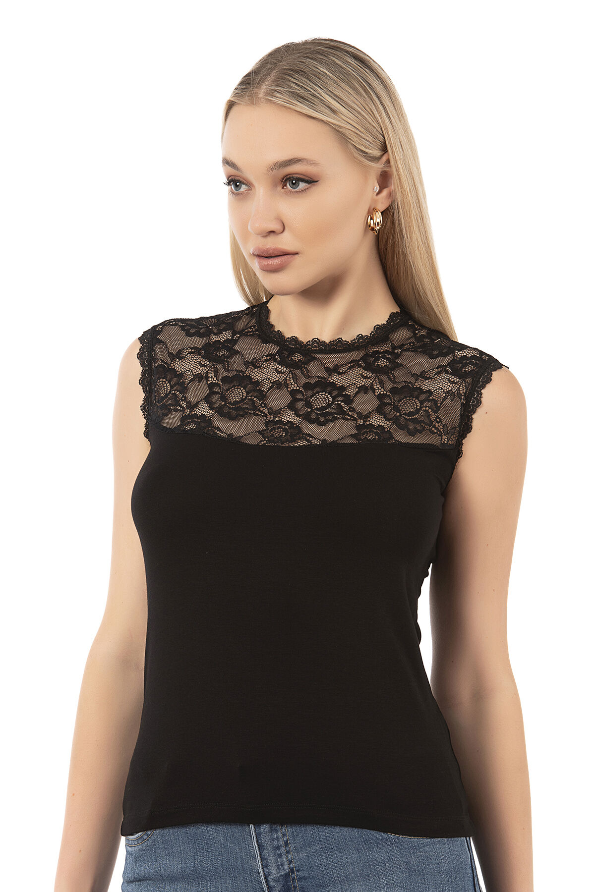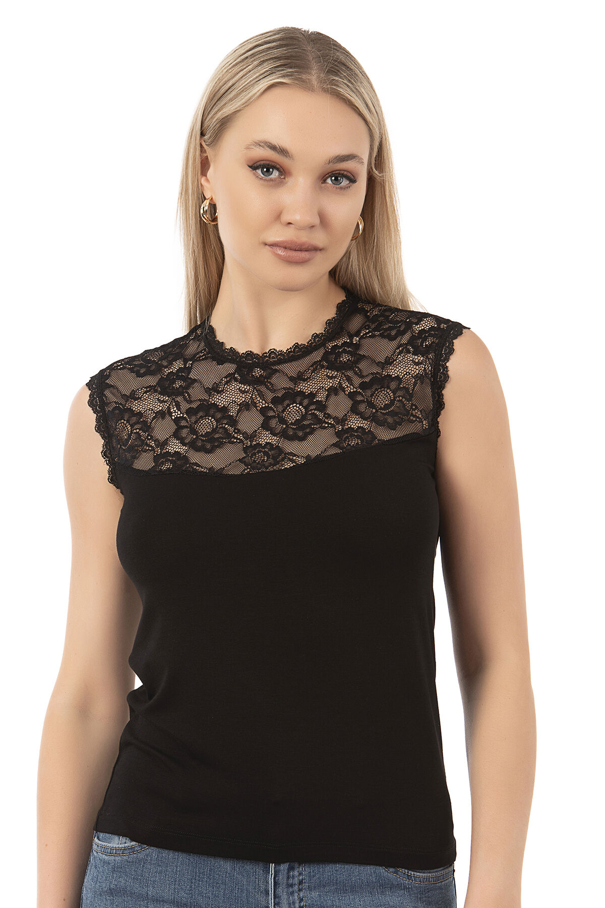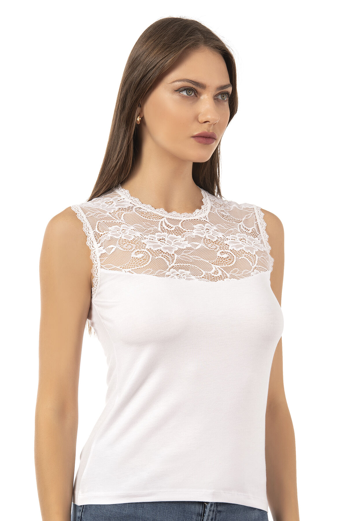 Özkan 7365 Kadın Premium Yumuşak Rahat Kumaş Viskon Dantel Detaylı Sıfır Kol Örme Bluz