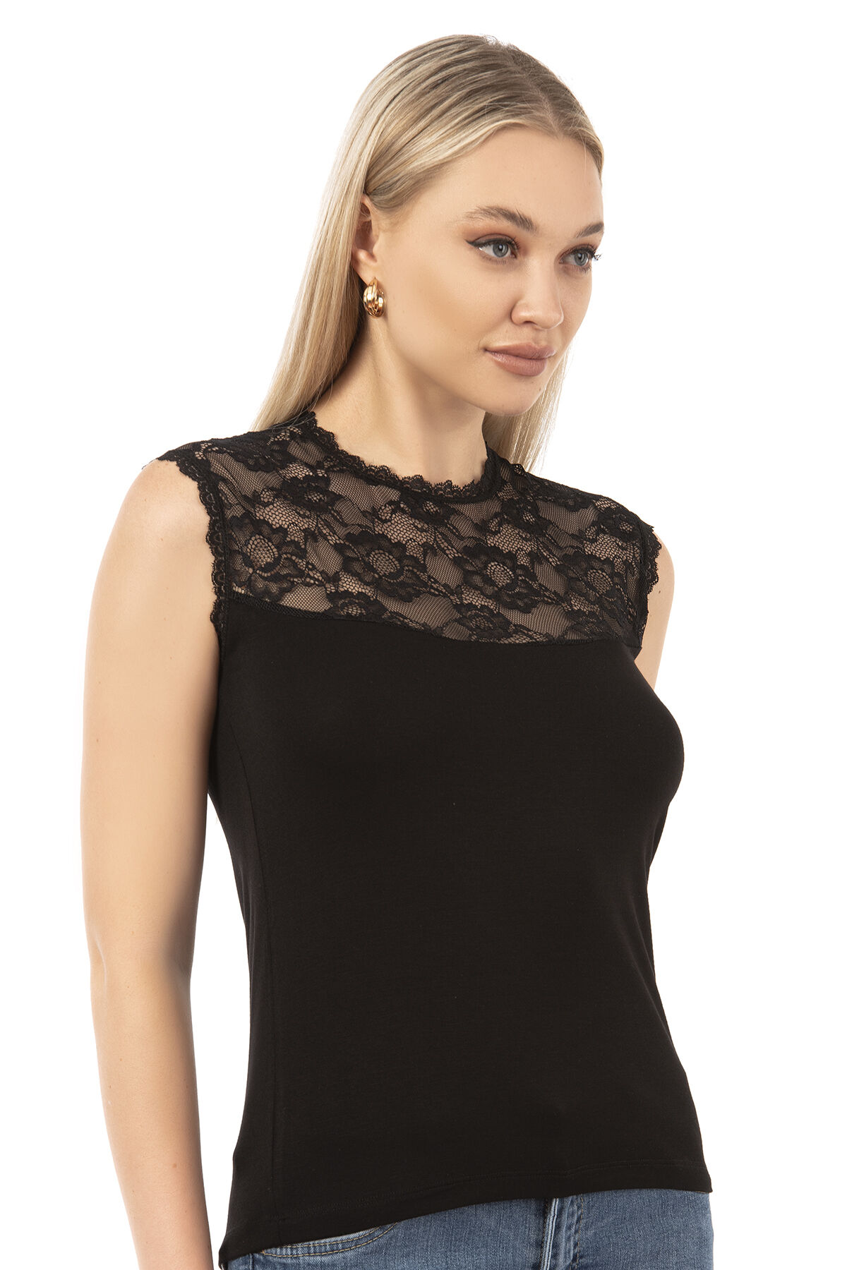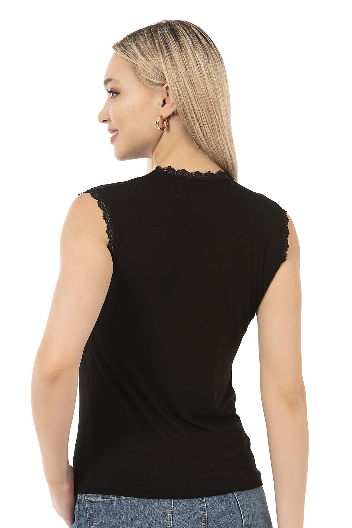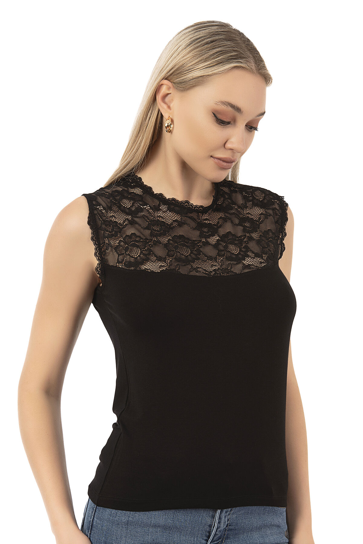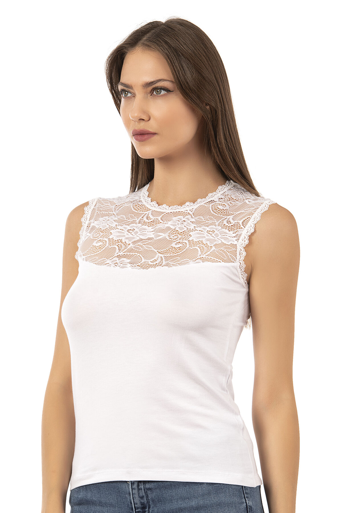 Özkan 7365 Kadın Premium Yumuşak Rahat Kumaş Viskon Dantel Detaylı Sıfır Kol Örme Bluz