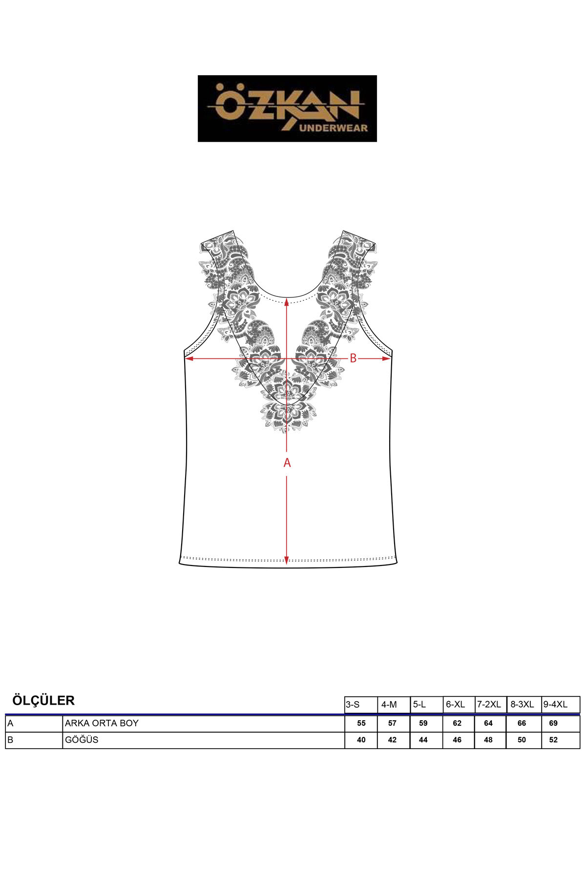 Ürünün Arka Ortadan Boyu: S- 55cm, M-57cm, L-59cm, XL-62cm, 2XL-64cm, 3XL-66cm, 4XL-69cm'dir;