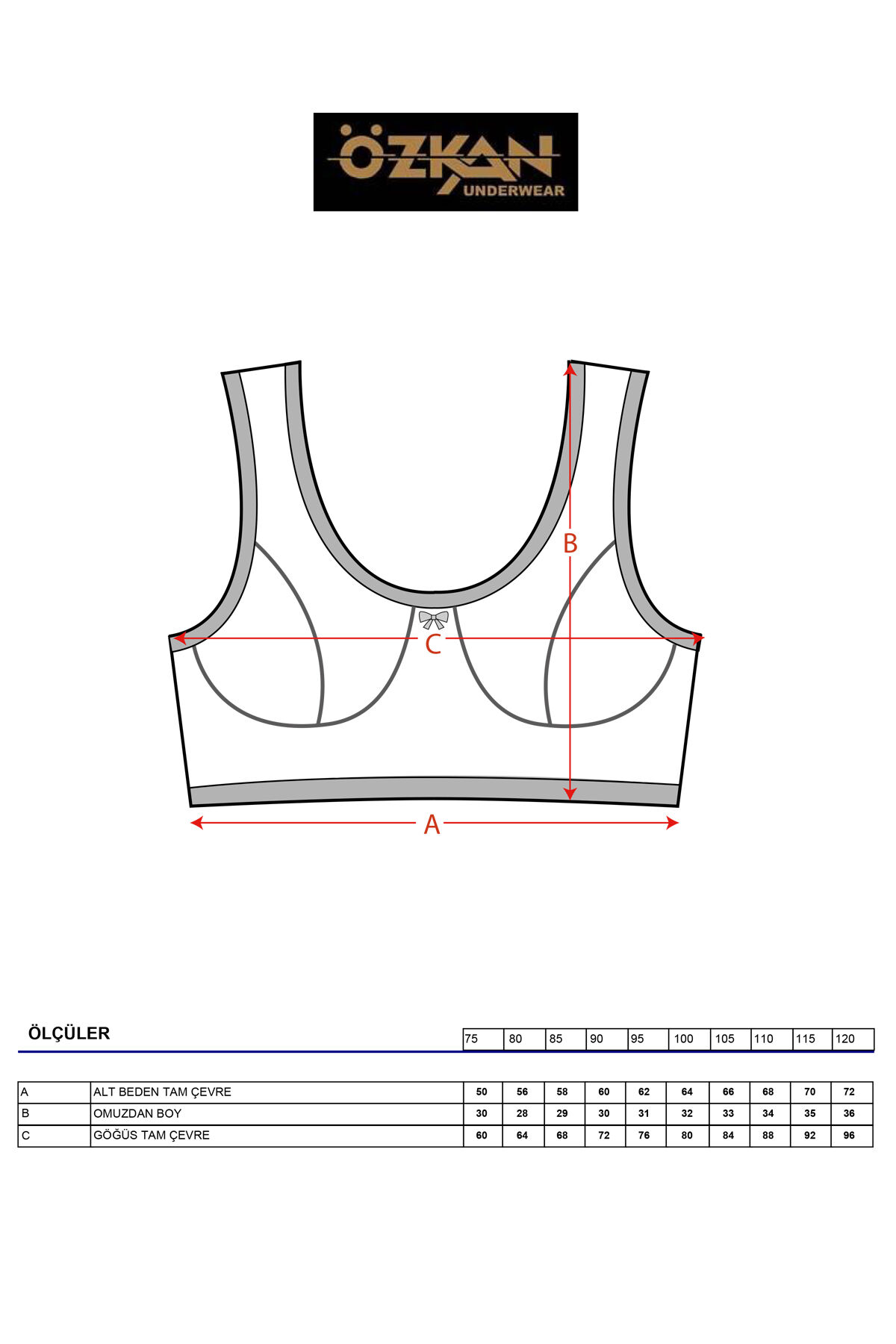 Ürünün Göğüsten Tam Çevre Genişliği: 75/60cm, 80/64cm, 85/68cm, 90/72cm, 95/76cm, 100/80cm, 105/84cm, 110/88cm, 115/92cm, 120/96cm'dir.;