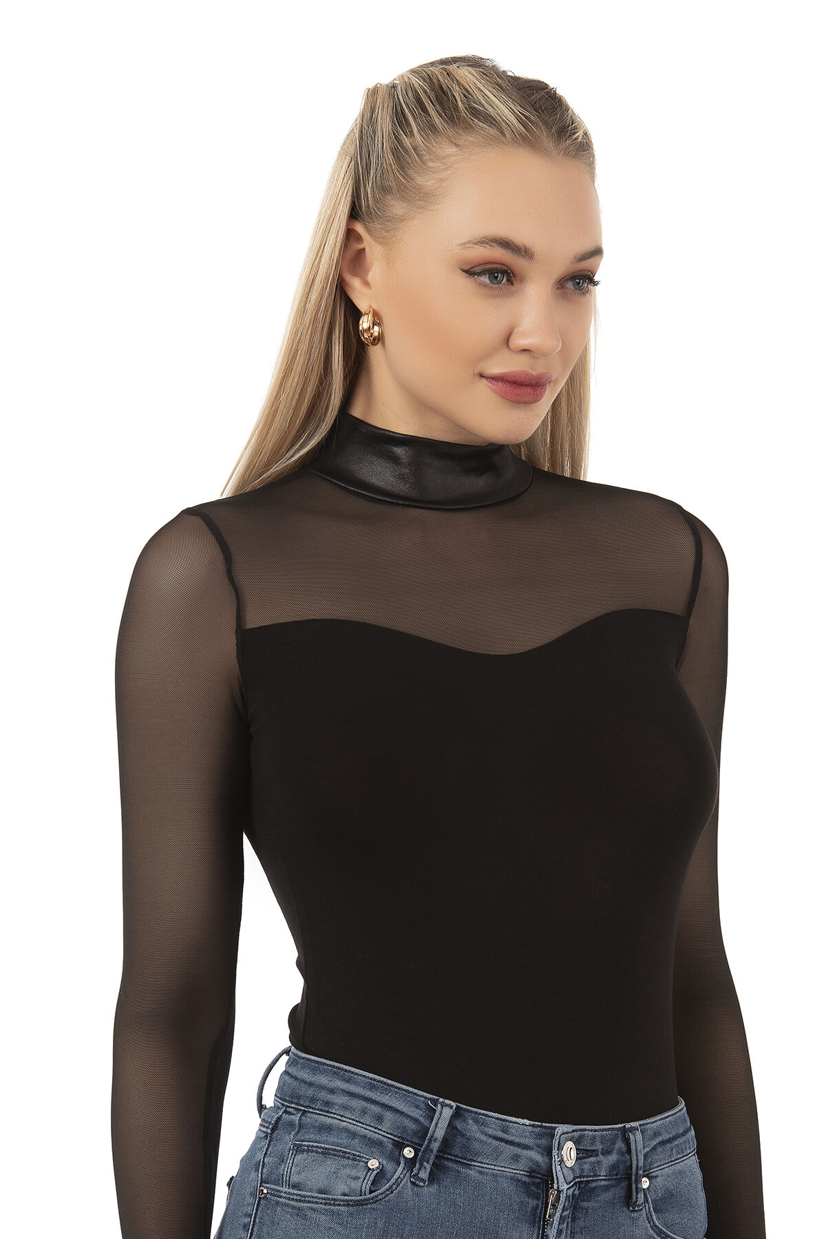 Özkan 20577 Kadın Viskon Yarım Balıkçı Yaka Tül Detaylı Esnek Rahat Uzun Kollu Kancalı Çıtçıtlı Body;