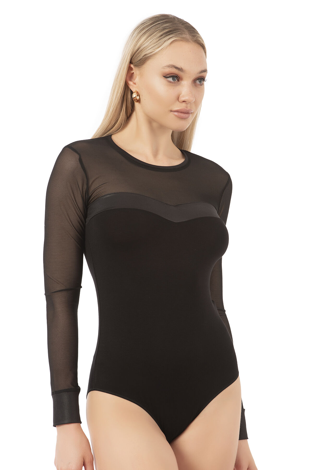 Özkan 22957 Kadın Siyah Viskon Uzun Kollu Yuvarlak Yaka Tül Detaylı Yumuşak Esnek Çıtçıtlı Body